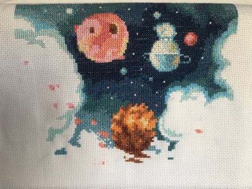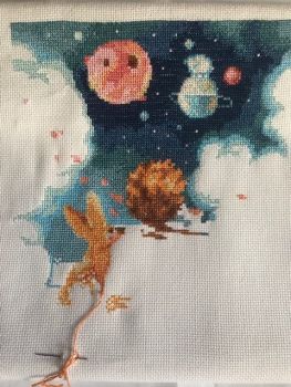 Работа потихоньку идёт. Добавилась Лиса. По ушкам это явно фенек, а по цвету огнёвка. Боюсь фото не передаёт всю яркость. Различная толщина (есть крестики в 2 и 3 нитки) и стежки даёт объём. Кстати, вы знали что знатоки Экзюпери уверены что это именно Лиса, а не Лис как в нашем переводе?