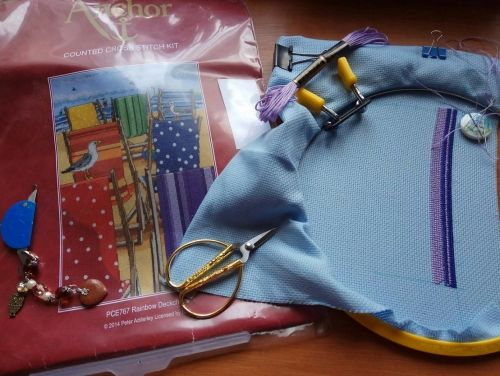 Наконец-то в моих загребущих ручонках все три Радужных набора. К огромному сожалению набор с домиками пришел без одного листа схемы(( но он есть в интернете, поэтому не буду расстраиваться. Начала вышивать PCE767 "Радужные шезлонги". Это не основной процесс. поэтому шить буду не очень быстро, но зато с улыбательным настроением. На сегодняшний день только начало процесса