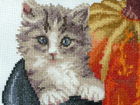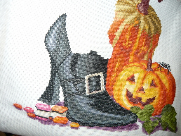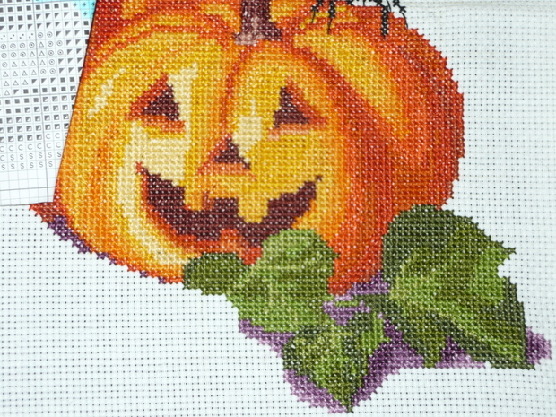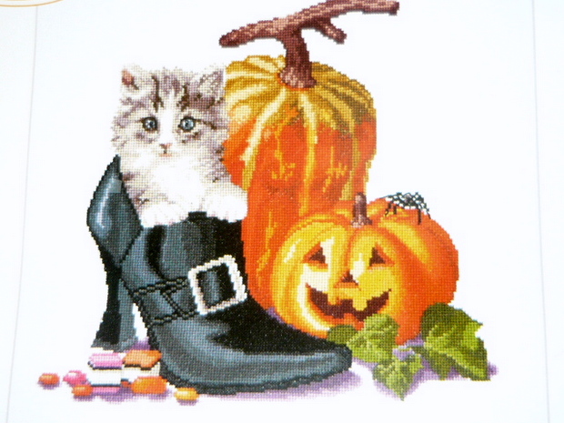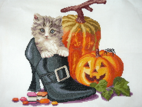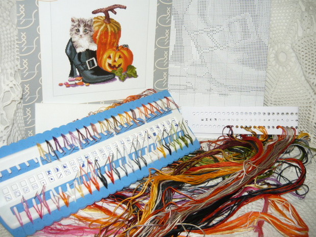 Добрового времени суток всем. Я очень соскучилась по процессам Теи Гувернер, Рим строить пока не могу решиться. А вот подарок за покупку набора "Москва" на выставке ФР 2012 мне захотелось вышить. На улице поздняя осень, почти зима, а на картинке яркая тыковка, да и еще очаровательная киска. Начала вышивать сегодня. О наборе. Размер 31 на 30 см, канва Аида, ниточки 45 цветов (один бленд), вышиваю крестиком в 2(!) нитки, схема на 2 листах. Согласитесь, что 2 нитки - это редкость для Теи, но в последнее время появляются дизайны, которые шьются не в 1 нить. Много черно-серого цвета (ботиночек), но зато есть и 2 яркие красочные тыковки, вот с них и начала. Девочки, не получилось сразу прицепить начало процесса. Вот такое небольшое начало.