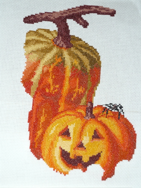Прошло 2 недельки и тыковки готовы, и даже паучок успел забраться на смешливую мордашку. Захотелось мне сделать отдельно яркие тыковки, а потом уже киску в ботике. Как-то мне показалось совсем не похоже на Теины дизайны. Все на контрасте, казалось, что слишком резкие границы, нет переходов.... Но когда тыковки были готовы, все оказалось реалистично и очень похоже на "живые" овощи, даже веточка из фиолетово-сиреневых ниток превратилась в коричневую, вполне реальную ветку. Как вам такие разноцветные тыковки?