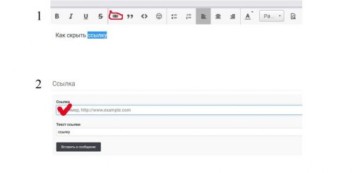 Пишем сообщение Выделяем в тексте то, под чем будет прятаться ссылка, и нажимаем на кнопочку "Ссылка" В окошко с галочкой складываем ссылку и нажимаем ОК. Спасибо NаТаlуа за картинку и инструкцию!