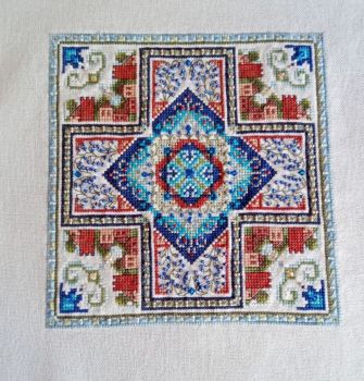 И снова здравствуйте после долгого перерыва Водный сад я начинала раза три и каждый раз что-то приключалось, что мешало мне его закончить. И вот сейчас как-то так все сложилось ... звезды наверное где-то сдвинулись и так сошлись, что потянуло меня на дизайны Мартины со страшной силой - ни на что больше смотреть не могу, ничего больше душа не хочет. В результате закуплены ниточки меланжевые и металлики, и ... снова начат Водный сад. На сегодня вышито процентов 40, дело двигается споро ... тьфу-тьфу ... сама себе установила срок - закончить к середине июня. Вышиваю подбором, так как, во-первых, шелк линяет, а во-вторых стоят сейчас все эти фельдеперсовые нитки как "мазератти". Вместо ДМС - мулине ПНК, шелк Caron и иже с ним заменен на меланж Мадейра и ДМС, металлик ДМС. Ну и фото: -